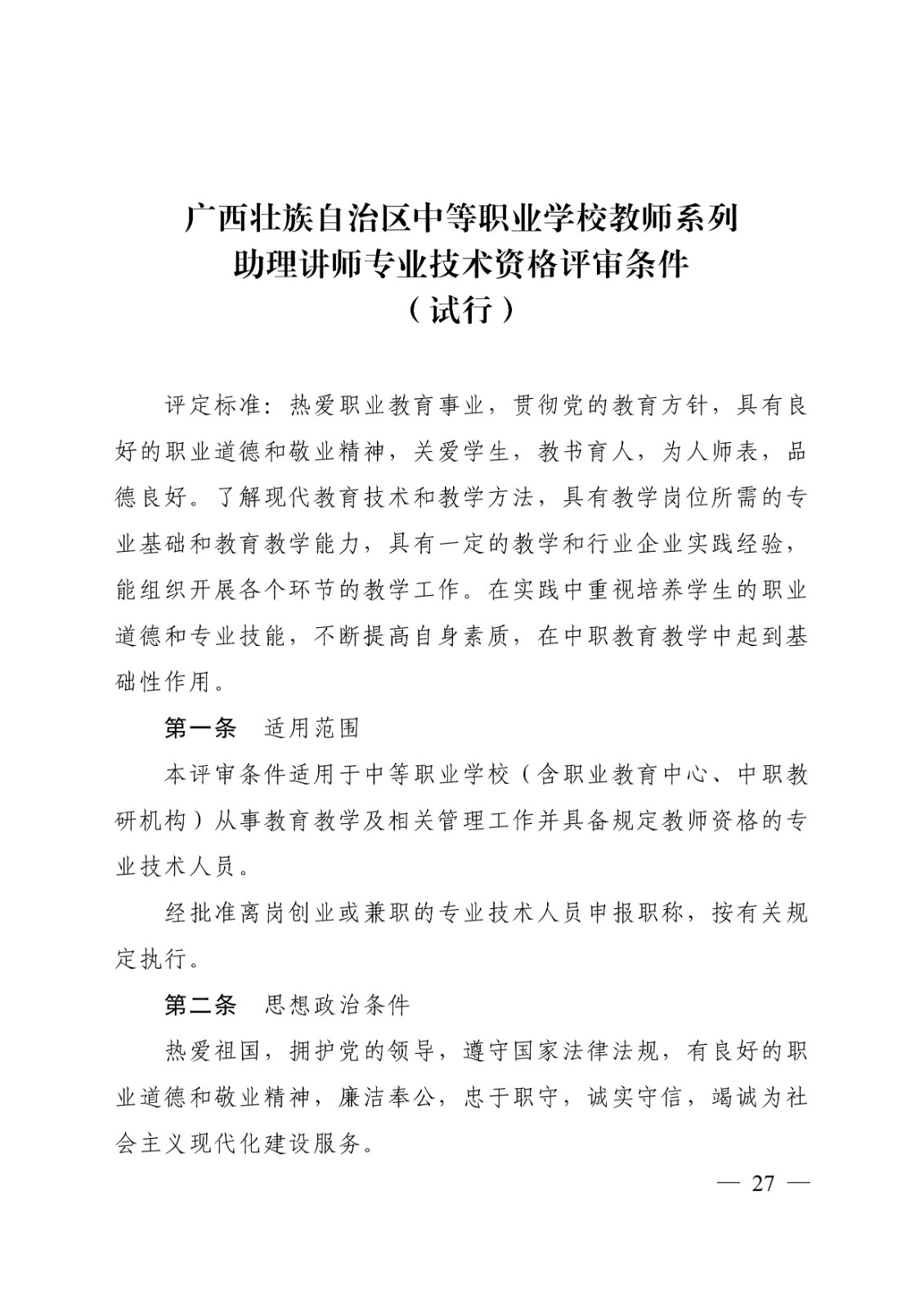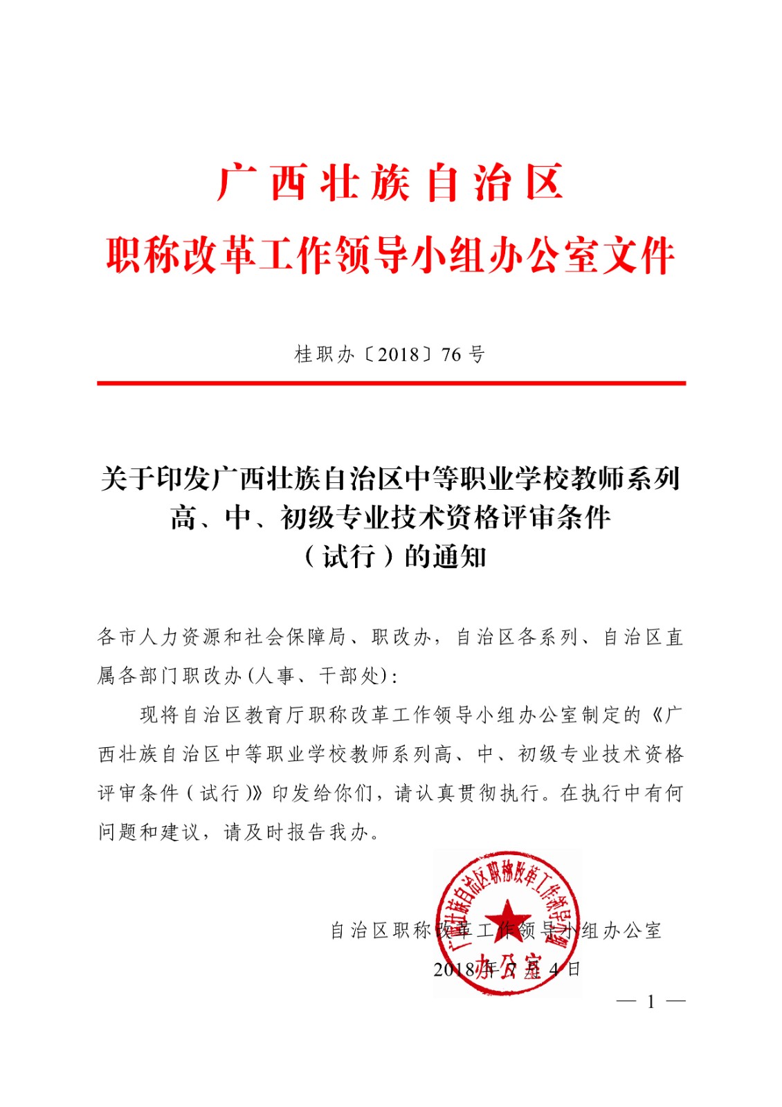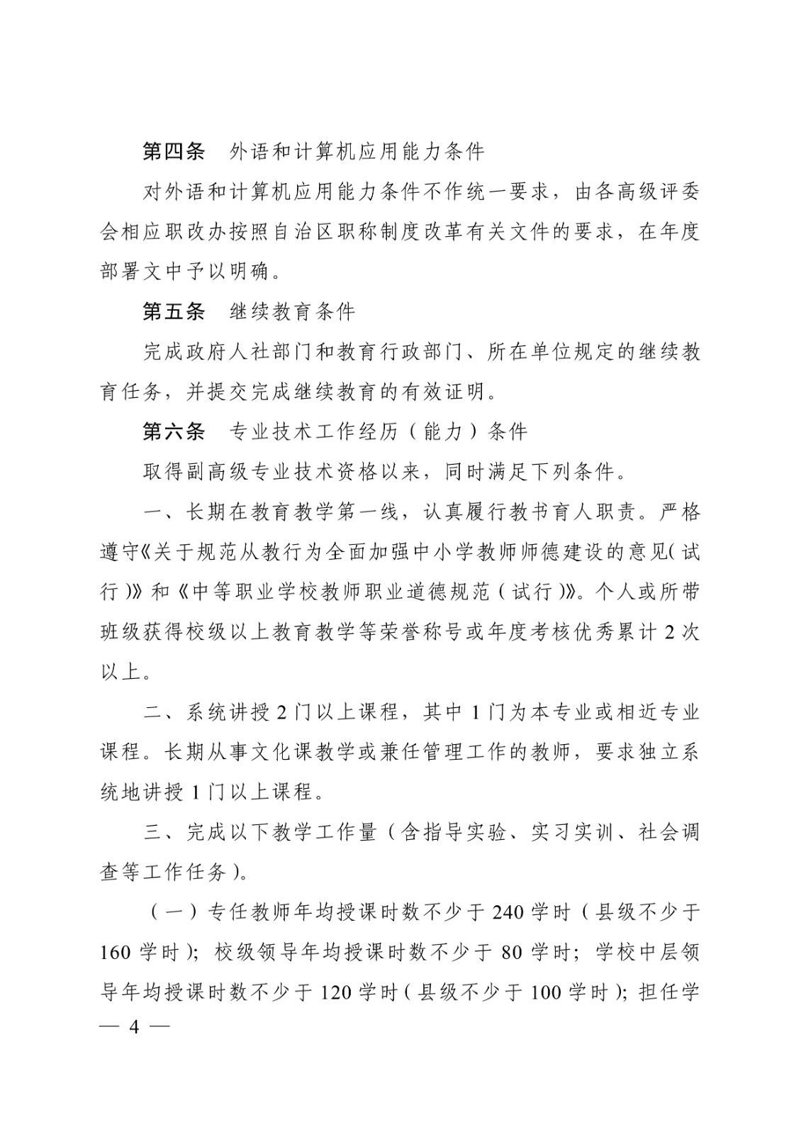 (桂教职改〔2018〕36号)转发关于印发广西壮族自治区中等职业学校教师系列高、中、初级专业技术资格评审条件(试行)的通知 时间:2020-09-17 18:49:44 来源:星空官方网站 浏览:次 分享到: 点赞 收藏 打印正文 关闭本页