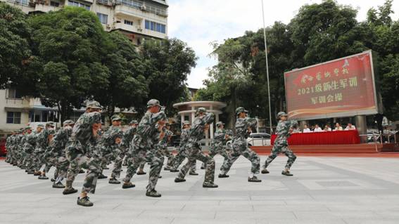2021级五百多名新生以一个个整齐的方块队形式接受检阅。他们精神饱满,动作整齐。表演内容有看齐、立正、稍息、报数、齐步走、向后转、跑步走等。每个班级动作规范,口号响亮,赢得全场阵阵喝彩,得到现场领导和老师们的一致好评。经教官综合考评,评选出53名优秀学员并对其进行表彰。