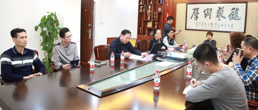 塔纳团长(左侧前排右三)在座谈会上介绍内蒙古杂技团的情况和与我校合作的设想