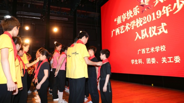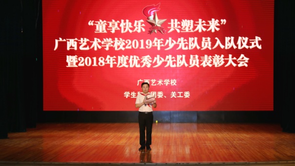 5月31日上午,星空官方网站在舞蹈实训基地举行了“童享快乐 共塑未来”2019年少先队员入队仪式暨2018年度优秀少先队员表彰大会等系列活动。广西壮族自治区文化和旅游厅党组成员、副厅长唐正柱在会上致词,并代表厅党组为孩子们送上节日慰问金;信息科技教育处调研员黄胜,星空官方网站党委书记罗征,党委副书记、纪委书记冯森,党委委员、副校长李其华、叶华生,督导员、关工委主任杨素妮,学生科、团委及关工委全体人员,学校全体少年儿童以及新少先队员、优秀少先队员参会。