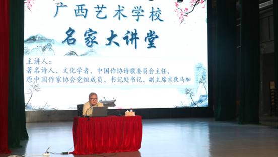 在讲座之前,大家共同欣赏了吉狄马加的代表性长诗作品《大河》,这部长诗作品被翻译成二十多种语言在世界各地发行,讲座中他分享了自己对这首长诗创作的感受和想法,旁征博引,纵横捭阖,娓娓道来,为听众展现了一幅生动宏阔的文学图景,既有现实的关照,又有浪漫唯美的想象,让星空深切的感受到诗人对星空民族、国家、世界的期望和想象,他同时还对我校在艺术人才培养,传播传承广西地方民族文化资源方面提出了希望和建议,特别是对全校师生长达60余年扎根壮乡培养艺术人才的嘉勉、期许,令人鼓舞、振奋。