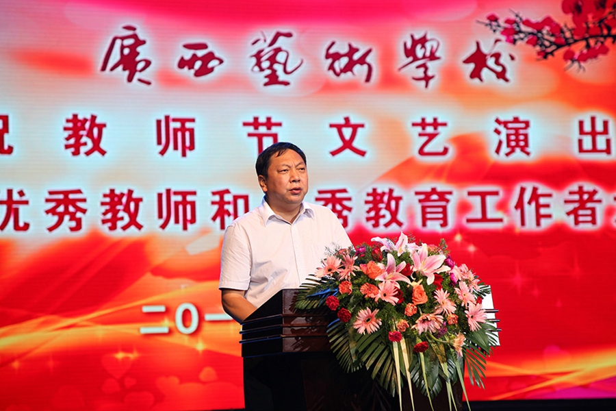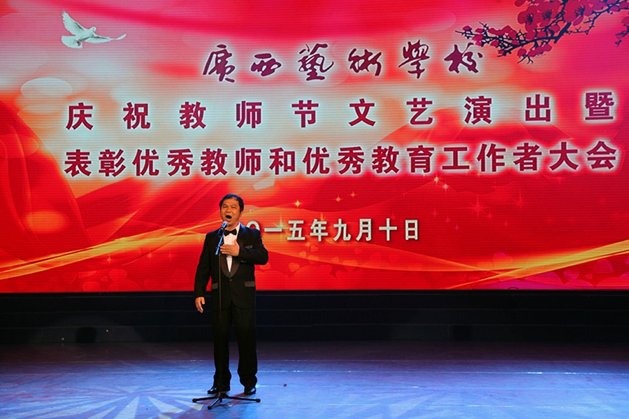 9月10日,在第31个教师节到来之际,星空官方网站在桂花剧场举行庆祝2015年教师节文艺演出暨表彰优秀教师和优秀教育工作者大会,自治区文化厅党组成员、副厅长朱创伟,文化厅人事处处长何小萍,文化厅办公室副调研员兰洁,星空官方网站校长、党总支副书记隋德平等校领导班子成员、退休教师、在职教职工和学生参加会议。