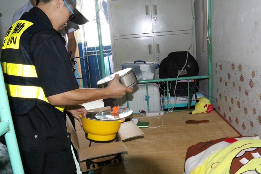 排查组来到学生公寓依次展开检查,发现男女生都有使用违禁物品,如热得快、电磁炉、电饭煲、水果刀等。其间,排查组还发现个别宿舍存在学生偷着吸烟、人离开后电器未关、乱拉乱接排插等违纪违规现象。排查组没收了违禁物品,对学生宿舍存在的安全问题进行记录,及时向相关部门和班主任、宿舍管理员反映,并要求进行整改。