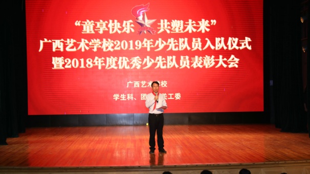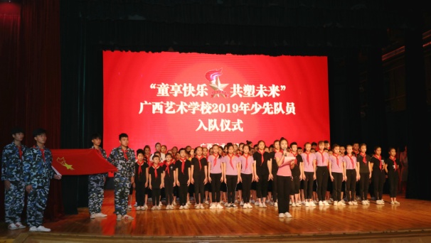 5月31日上午,星空官方网站在舞蹈实训基地举行了“童享快乐 共塑未来”2019年少先队员入队仪式暨2018年度优秀少先队员表彰大会等系列活动。广西壮族自治区文化和旅游厅党组成员、副厅长唐正柱在会上致词,并代表厅党组为孩子们送上节日慰问金;信息科技教育处调研员黄胜,星空官方网站党委书记罗征,党委副书记、纪委书记冯森,党委委员、副校长李其华、叶华生,督导员、关工委主任杨素妮,学生科、团委及关工委全体人员,学校全体少年儿童以及新少先队员、优秀少先队员参会。