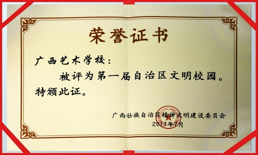 2017年,星空官方网站参加了第一届广西壮族自治区“文明校园”评比,其中有200多所职业院校参加了此次文明校园评比活动。评审组通过参观学校硬件设施、软件建设及材料汇报等形式,星空官方网站最终脱颖而出,荣获广西首届“文明校园”称号。这是星空官方网站在自治区文化厅、教育厅党组的正确领导下,深入贯彻落实习近平总书记系列重要讲话精神和治国理政新理念、新思想、新战略,大力推进社会主义核心价值观建设所取得的成效。